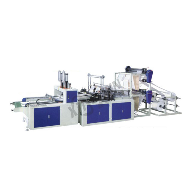 本机采用四道放料,前后底封,冷切,冲孔连续完成的高产量本色背心袋制袋机。